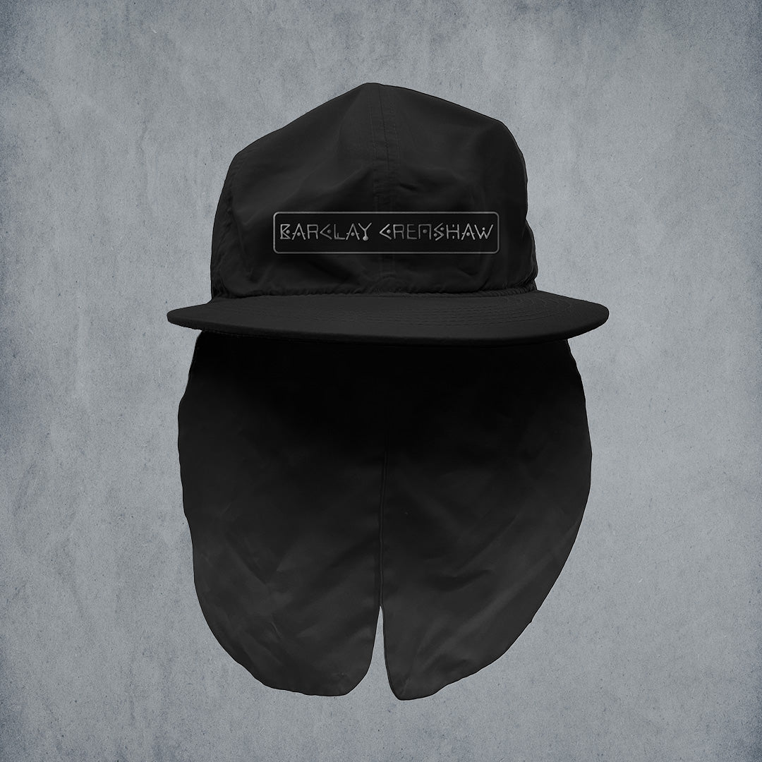Barclay Crenshaw Silver Thread "Trap Hat" ---- Features silver threaded logo patch on custom made baseball style hat with additional flaps. Based on the original trap hat Barclay wore as a little kid at Roxboro Elementary school. All hats are custom made cut n sew. Protect your neck sun flaps flow in the wind and also create a hip-hop Samurai silhouette.