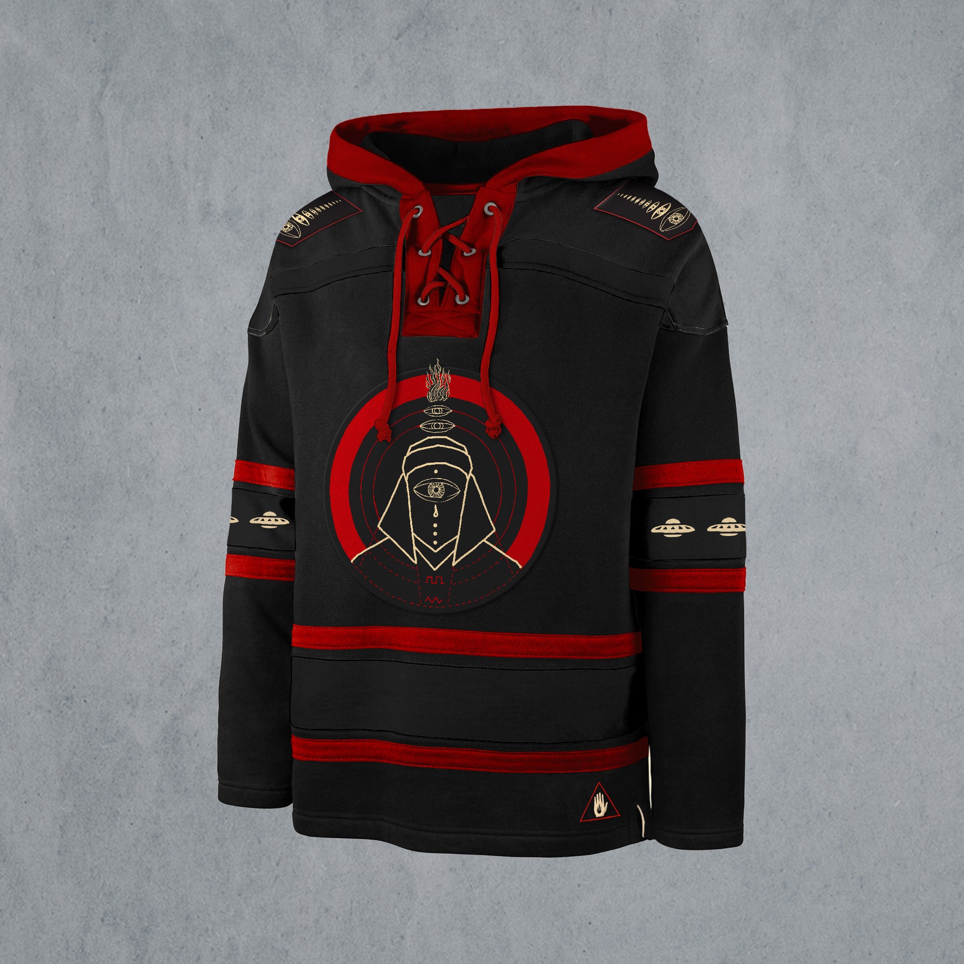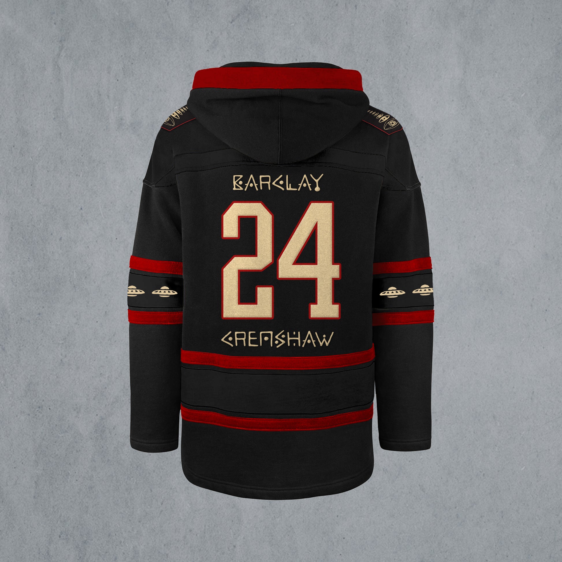 We're excited to present the first Barclay Crenshaw Hockey Jersey. Throwback 90s retro design. Mid-weight fleece with a thermalined hood, round thick drawcords, plus twill appliques on the body, shoulders, back and embroidered Barclay Crenshaw on the back and alien ships on the sleeves.