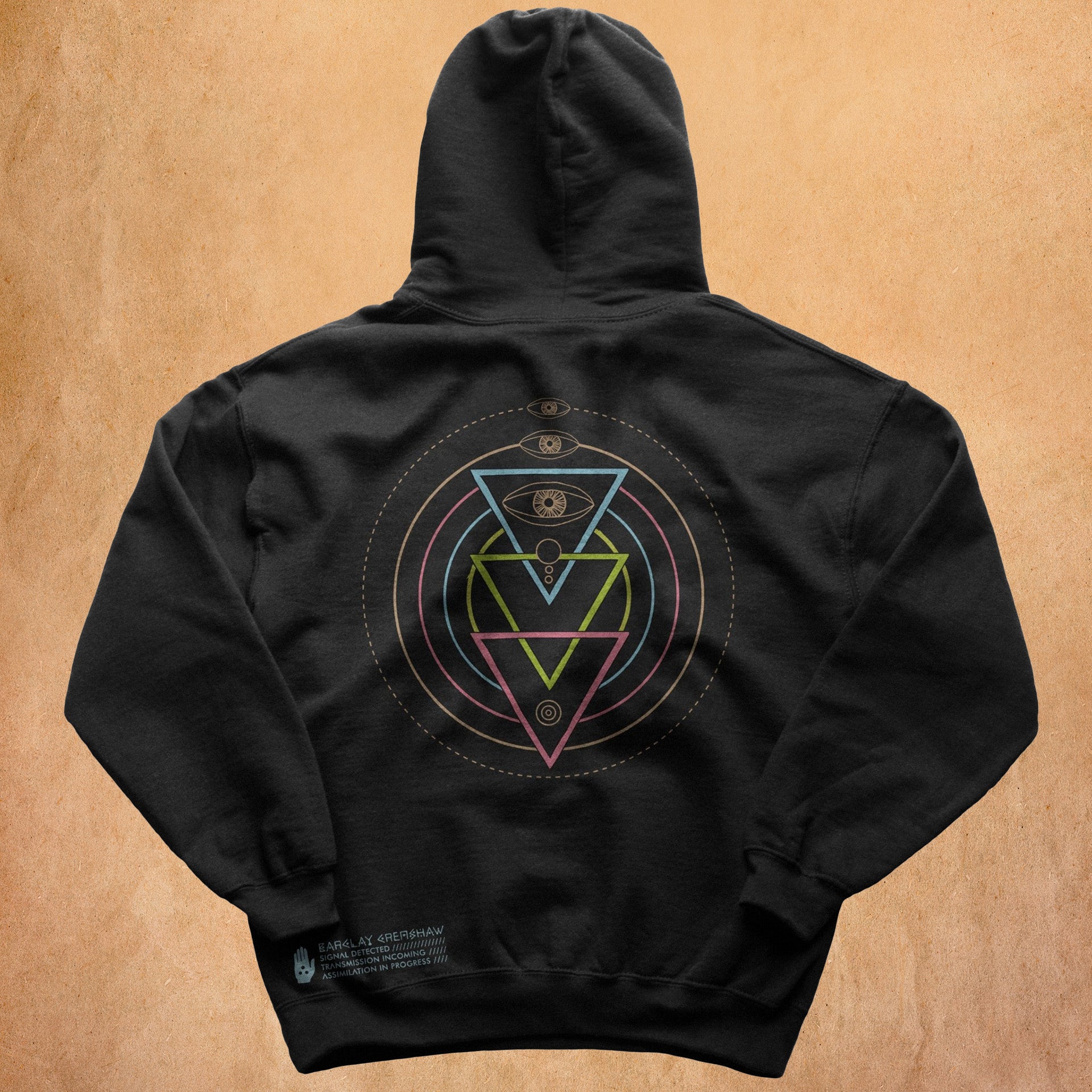 Open Channel "Circle Channel Hoodie" -- Black with color screenprints. Soft fleece interior. Custom shoulder patches and loop tag. Custom embroidered front facing "Barclay Crenshaw."
